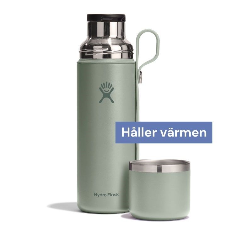 Pris: 700 kronor Vikt: 659 g Material: Rostfritt stål Storlek: 29 cm x Ø8 cm, rymmer 828 ml Temp efter 6 h: 86 C Köpinfo: alewalds.se Kort & gott: Smidig, större termos som rymmer 5–6 koppar. Imponerande lång värmehållning och plus för att alla delar tål maskindisk. Passar bra för en grupp vänner, familjeäventyr eller en aktivitet som paddling, där vikt och storlek inte spelar lika stor roll. Kalla fakta: Stor termos som ska hålla drycken varm eller kall i 30 timmar. Dubbelväggig vakuum-konstruktion, mjukt bärhandtag, rejäl skruvkork och isolerad mugg som lock. Finns flera färger och i en större storlek på 946 ml. Tål maskindisk. Hiss eller diss: En sprillans ny kvalitetstermos. Mer robust och tålig än billigare varianter. Termosen håller värmen sina utlovade 30 timmar med bravur! En av två termosar i testet med längst värmehållning. Trevligt mjukt handtag som möjliggör upphängning. Väl tilltagen öppning som gör den lätt att fylla och diska. Den tål maskindisk, vilket sticker ut. Termosen är slittålig och klarar falltest galant utan läckage. Strålen är jämn och bra. Också – mycket snygg! Plus: Tålig, fin, extremt lång värmehållning! Minus: Tyngre och dyrare än många andra.