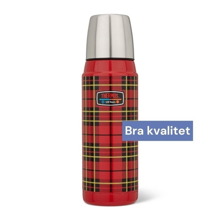 Pris: 399 kronor Vikt: 378 g Material: Rostfritt stål Storlek: 25 cm x Ø 7,2 cm, rymmer 470 ml Temp efter 6 h: 81 C Köpinfo: clasohlson.com Kort & gott: Klassisk termos man kan lita på under de flesta turer där cirka tre koppar kaffe önskas. Kul mönster, imponerande lång värmehållning. Passar fint på vandring och i vardag. Kalla fakta: En limited edition och en hyllning till de ursprungliga rutmönstrade termosarna. Ska hålla värme 18 timmar och kyla i 24 timmar, med vakuumisolering, rostfritt stål och skruvkork. Locket är en rostfri stålmugg. Ej maskindisk. Hiss eller diss: Ikoniska Thermos har skapat en termos med retrovibb som håller värme och kyla i utlovade timmar – och mer därtill. Efter 20 timmar är det fortfarande brännhett! Dess storlek är behändig för de flesta turer. Ett mönster som sticker ut och andas picknick. Fin, kontrollerad stråle, enkelt att hälla och diska. Locket blir en ganska liten kopp som håller värmen bra. Bra pris! Plus: Bra kvalitet, håller värmen mycket bra. Minus: Kan bli hal med handskar på.