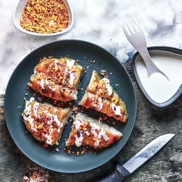 Surdegsbröd med ört- och vitlökssmör, yoghurt och dukkah