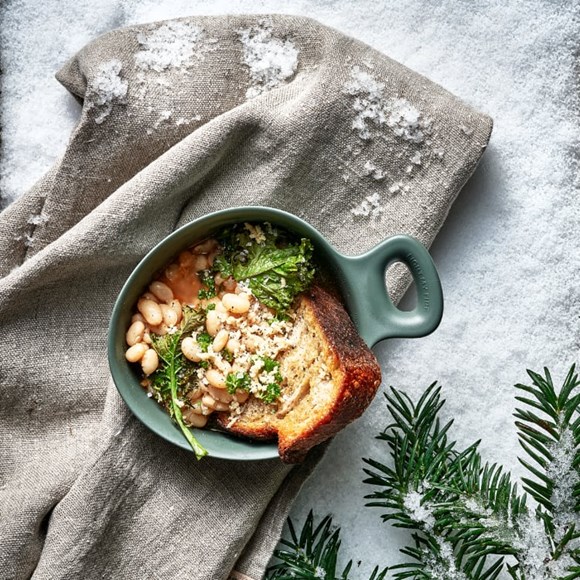 Krämiga vita bönor, rostad grönkål, smulad ost och grillat bröd
