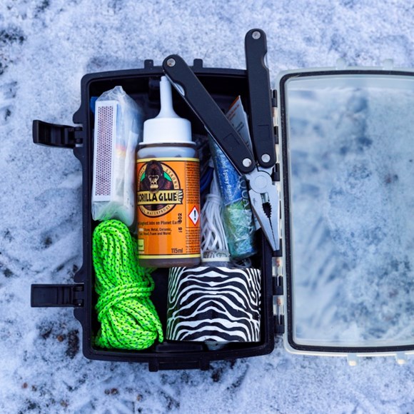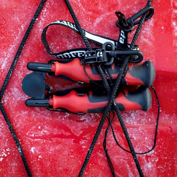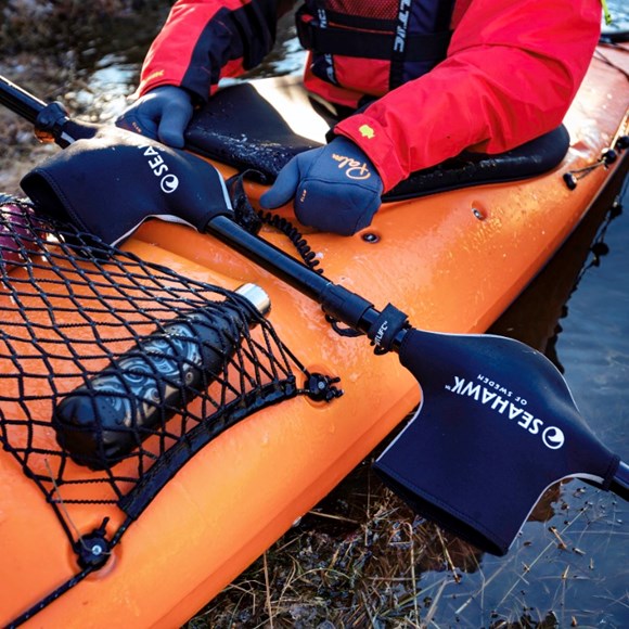 Vid vinterpaddling används samma kajak, kapell och paddel som resten av året, men komplettera med reparationskit. I mörka vatten är stenar svåra att se, så lim och silvertejp kan rädda skador. Plastkajaker tål mer men är trögare, och tänk på att kalla paddlar blir skörare – ha alltid en extra i sällskapet. Perimeterlinor fryser lätt fast; klä dem gärna med gummislang för bättre grepp med vantar.