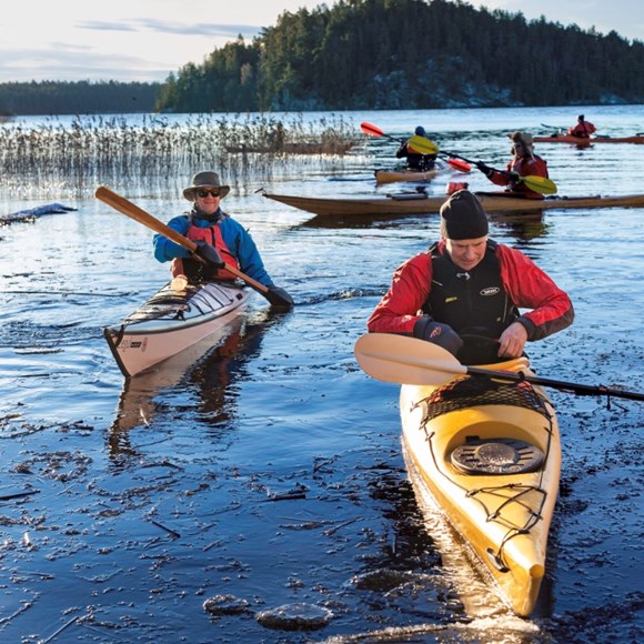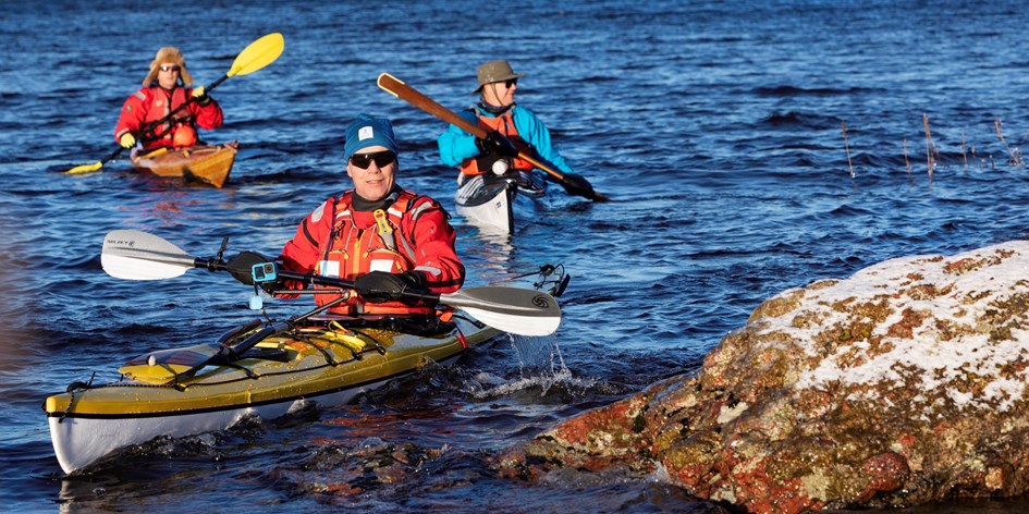 Denna lördagsförmiddag visar termometern sex-sju minusgrader i skuggan. Vinden är nordlig, fyra till åtta sekundmeter, men opålitlig – riktningen kan skifta snabbt. Färgglada kajaker bryter av mot det tunna lagret av vit snö och det ljusblå, oljeliknande vattnet.