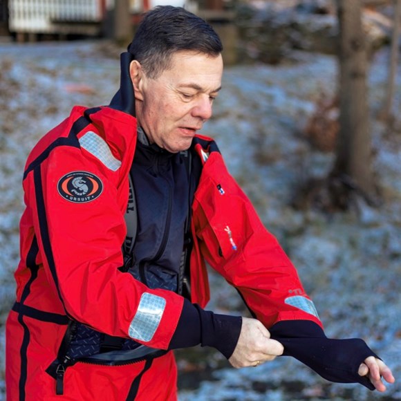 Torrdräkt är en nödvändighet. När dräkten är på, sätt in ett finger i halsmudden och kryp ihop så att luften pressas ut för en bättre passform. Hur varmt det blir bestäms av vad du har på dig under. Ull, fleece eller syntet är bra material som transporterar bort fukten bort från huden och ut mot torrdräkten. Kapell på kajaken är ett måste för vinterpaddling. Dels för att hålla dig torr, och dels för att en liten mängd vatten i kajaken ökar risken för kapsejsning.