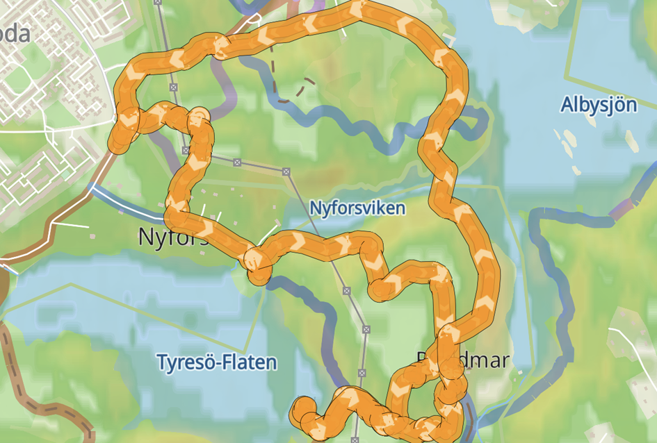 Vi möttes vid busshållplatsen i Nyfors. Arild tog täten och vi gav oss i väg på en av lederna och kom snart till den gamla forsen där det varit mycken industriell verksamhet under lång tid. Nu strömmade vattnet fritt och enligt uppgift brukar man kunna se strömstarar där. Vi vandrade vidare och det började bli dags för att ta oss till det tänkta raststället på en udde i sjön Tyresö-Flaten och dit fick vi delvis klättra på mindre stigar.