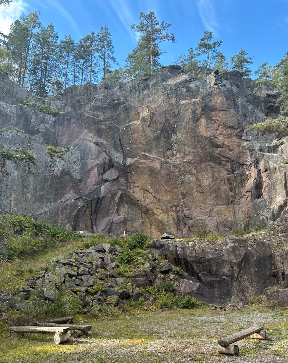 Vi åt vår lunch vid Rödberget i Graversfors där det bröts granit till en bit in på 1900-talet. Turen fortsätter på grusvägar och stigar och innan vi kommer tillbaka till vår startplats går vi genom den sedan ett drygt år stängda campingen.