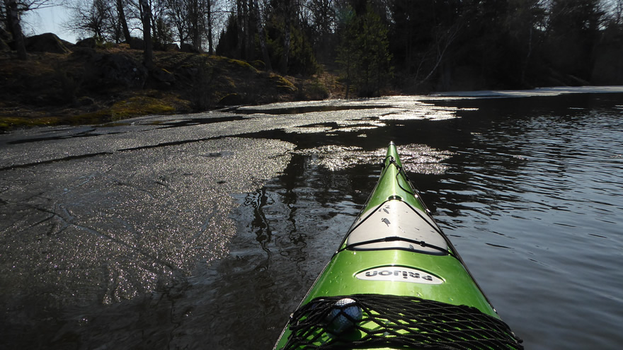 Valloxen sköljer! Dvs isen går! Igår torsdag var i princip hela Valloxen väster om bron istäckt. Se bild från torsdagen. I morse och i förmiddags började isen brytas upp i den " Spanska värmen" och måttliga Sydvästen (vinden). På eftermiddagen idag var endast några lävikar istäckta. Nu kan man paddla runt hela sjön på båda sidor om bron. Isränna bruten intill lilla ön O bron. Det går fort ibland.Tidigare erfarenheter sa att Valloxen sköljer i veckan runt 20 april. Idag hörde jag att "förr" sa man 26 april plus minus en vecka. Senare år har ju isen försvunnit långt tidigare. Ett annat sätt att mäta kajaksäsongens start är att den börjar max en vecka efter sista skridskoturen på Valloxen. Hur blev det i år? Dagens rektur visade att skrinnarna får det svårt och att allehanda vårfåglar är på plats inklusive Fiskgjuse (skräm ej!) Knipor, 70 talet Storskrakar, Tärnor mm.