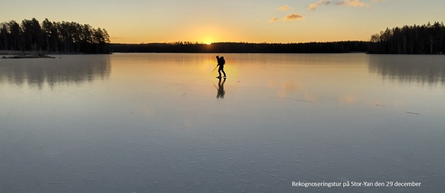 Därefter kom flera värmeattacker följa av vindattacker som förstörde isarna på flera sjöar. Men de små skogssjöarna höll stånd och på dessa åktes det en del. Flera rekognoseringsturer mitt i veckan har dock då och då kunna bjuda på fina isar. Höstsäsongen avslutades på nyårsafton med en tur på Stor-Yan och Lill-Yan på fin kärnis, pudrad med lite snö. På nyårsdagen kom nästa attack nu med massor av snö. Vi hoppas verkligen på en bättre skridskovår.