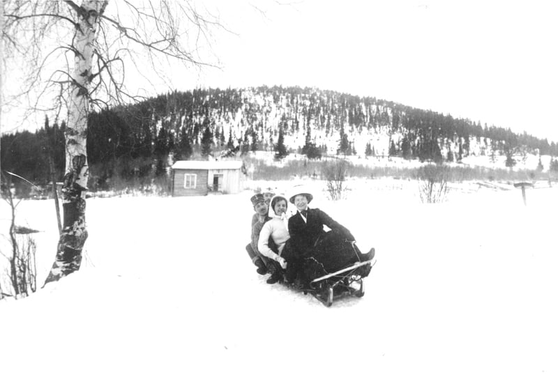 Kälkåkning på Hullstaklippen. ”En av det gamla glada Sollefteås trevligaste trevligheter, som borde haft en lång rad av stjärnor i Baedeker, var på sin tid kälkbacken vid Hullsta. Under åren 1912 - 1922 roade alltså sig Sollefteåborna med kälkbacksåkning. Den var en sporttillgång av rang, där alla fingo en uppfriskande och stärkande motion under uppklättringen till klippen och därpå en tjusande sensation under nedrutschningen utför den 1 km långa, slingrande isbanan. Vi bör ej heller glömma den underbara utsikten över ett av Ådalens vackraste partier, som man en strålande vinterdag hade från berget.” / Lasse King
