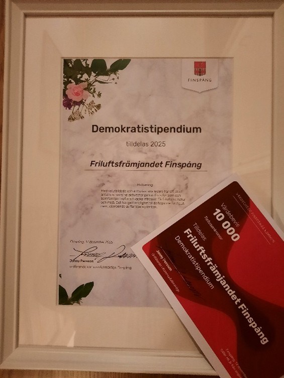 Tre veckor innan överlämningen blev jag uppringd från Finspångs kommun som meddelade att Friluftsfrämjandet i Finspång kommer att tilldelas ”2025 års Demokratistipendium” i samband med kommunfullmäktiges möte 17 december. Men det skulle hållas hemligt.